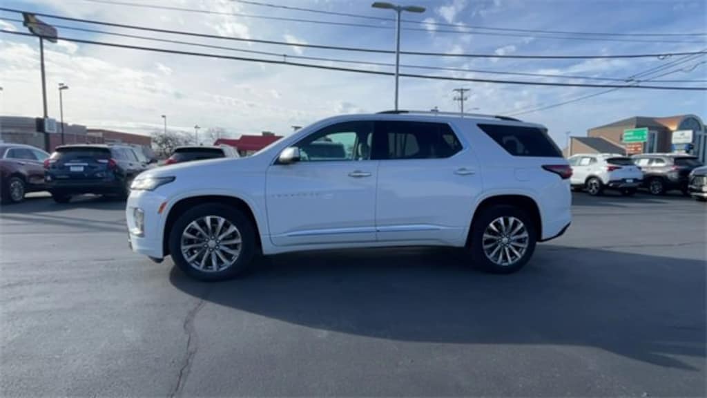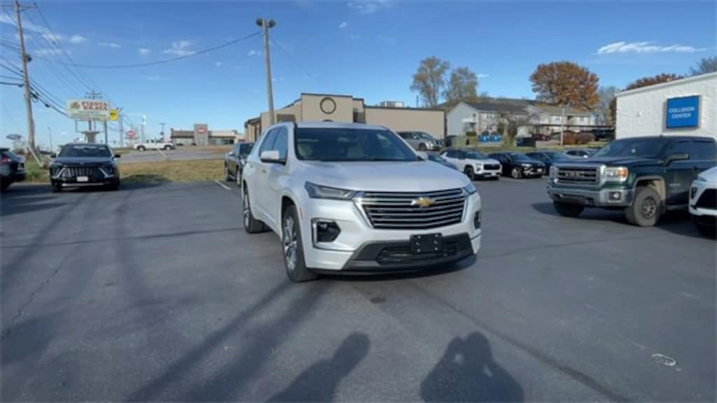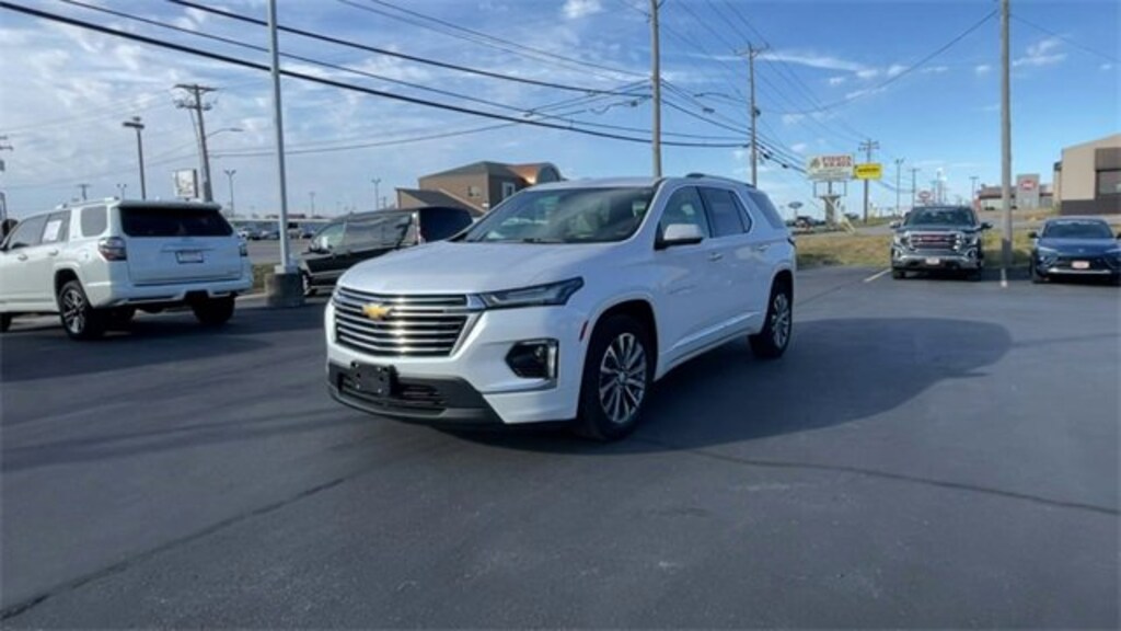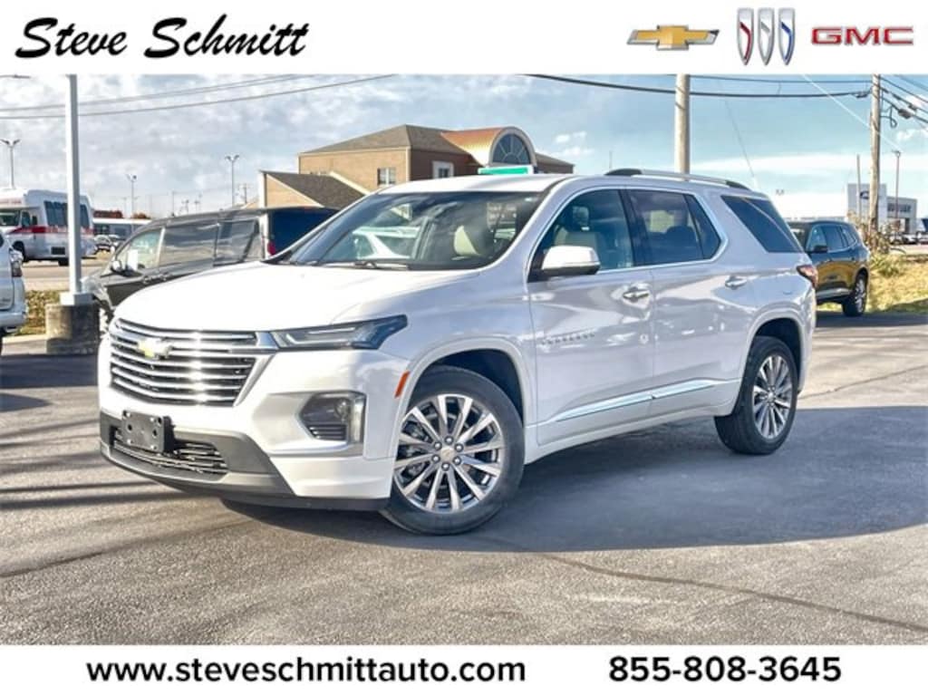 Recent Arrival! 2023 Chevrolet Traverse Premier Iridescent Pearl Tricoat Clean CARFAX. CARFAX One-Owner. Odometer is 7794 miles below market average! 18/27 City/Highway MPGIf you're looking for a new car, truck or SUV near St. Louis or Edwardsville, then look no further than Steve Schmitt Inc. At our Highland dealership, we have a large variety of Chevy, Buick, and GMC models, all just ripe for the picking. Steve Schmitt has delivered four generations of Customer Service...right here in Highland! Steve Sr. Plays an active role in the dealership as well as the community, and Steve Jr. Manages the day-to-day operations. At Steve Schmitt Chevy Buick GMC, it is more than a name on a sign...it is our family looking forward to exceeding your family's expectations! This vehicles includes the following features Front License Plate Bracket Mounting Package, Preferred Equipment Group 1LZ (Heated 2nd Row Outboard Position Seats, Heated Driver & Front Passenger Seats, and Ventilated Driver & Front Passenger Seats), 10 Speakers, 3.49 Axle Ratio, 3rd row seats: split-bench, 4-Wheel Disc Brakes, 6-Way Power Front Passenger Seat, 8-Way Power Driver Seat Adjuster, ABS brakes, Air Conditioning, Alloy wheels, AM/FM radio: SiriusXM with 360L, Apple CarPlay/Android Auto, Auto High-beam Headlights, Auto-dimming door mirrors, Auto-dimming Rear-View mirror, Automatic temperature control, Bose Premium 10-Speaker Audio System Feature, Brake assist, Bumpers: body-color, Compass, Delay-off headlights, Driver door bin, Driver vanity mirror, Dual front impact airbags, Dual front side impact airbags, Electronic Stability Control, Emergency communication system, Exterior Parking Camera Rear, Four wheel independent suspension, Front anti-roll bar, Front Bucket Seats, Front Center Armrest, Front dual zone A/C, Front Passenger 2-Way Power Lumbar, Front reading lights, Fully automatic headlights, Garage door transmitter, Heated door mirrors, Heated front seats, Heated rear seats, Heated steering wheel, Illuminated entry, Leather steering wheel, Low tire pressure warning, Memory seat, Navigation System, Occupant sensing airbag, Outside temperature display, Overhead airbag, Overhead console, Panic alarm, Passenger door bin, Passenger vanity mirror, Perforated Leather-Appointed Seat Trim, Power door mirrors, Power Driver Lumbar Control, Power driver seat, Power Liftgate, Power passenger seat, Power steering, Power windows, Premium audio system: Chevrolet Infotainment 3 Plus, Radio data system, Radio: Chevrolet Infotainment 3 Plus System w/Navi, Rear air conditioning, Rear anti-roll bar, Rear reading lights, Rear window defroster, Rear window wiper, Remote keyless entry, Security system, SiriusXM w/360L, Speed control, Speed-sensing steering, Spoiler, Steering wheel memory, Steering wheel mounted audio controls, Tachometer, Telescoping steering wheel, Tilt steering wheel, Traction control, Trip computer, Turn signal indicator mirrors, Variably intermittent wipers, Ventilated front seats, Voltmeter, and Wheels: 20 Metallic Machined-Face Aluminum.